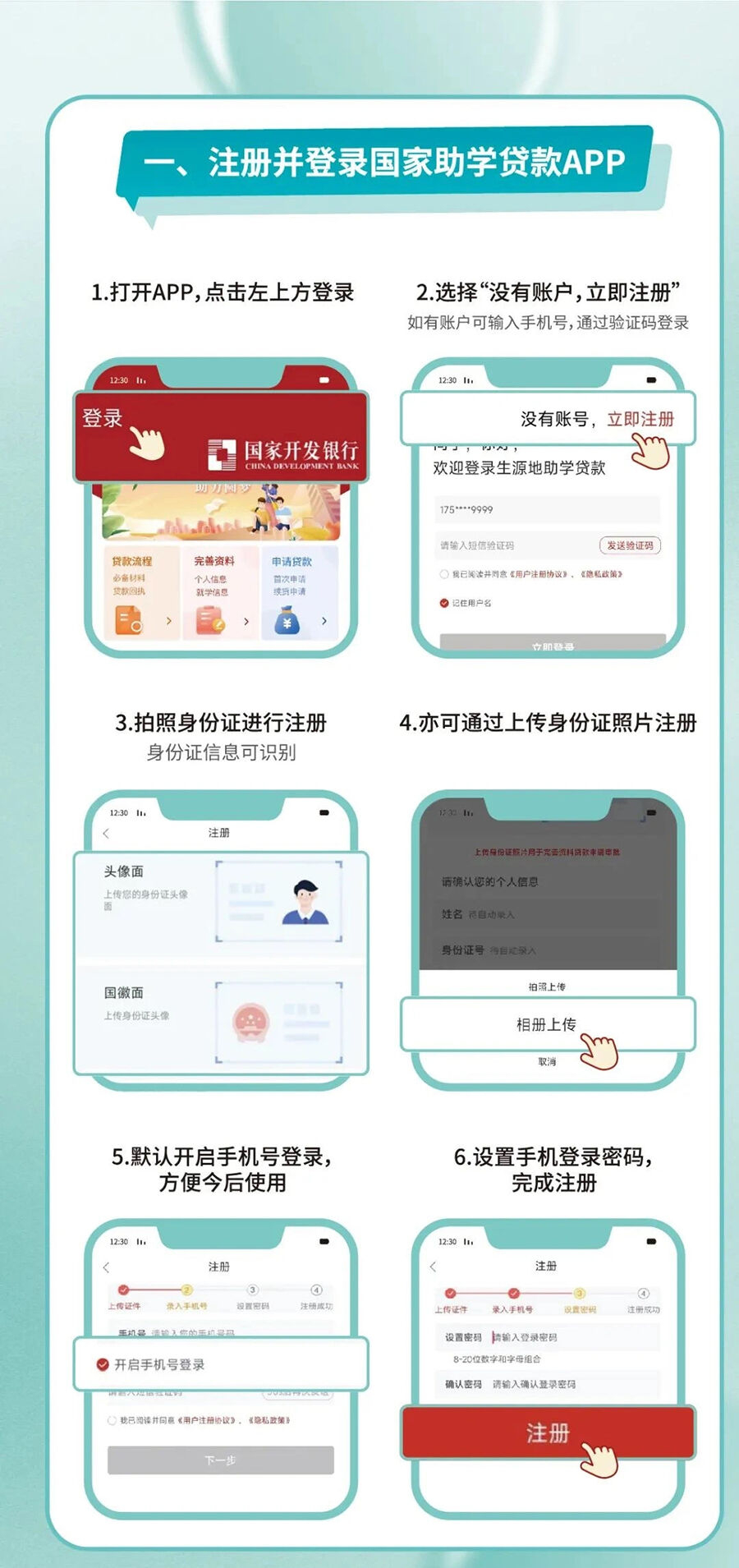 为提升便利性,国家开发银行今年推出了“国家助学贷款”手机客户端,下载“国家助学贷款”客户端后,可在手机端完成国家开发银行承办的国家助学贷款申请、合同附件上传、贷款状态查询、本金延期申请、业务咨询等。以办理生源地信用助学贷款续贷为例,学生只需要通过客户端实名认证,即可提交续贷申请、完成线上签约,整个过程不到3分钟。待高校老师录入回执后,整个申请流程即全部完成,方便快捷。具体操作流程如下: