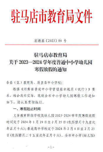 驻马店市高中寒假时间公布
