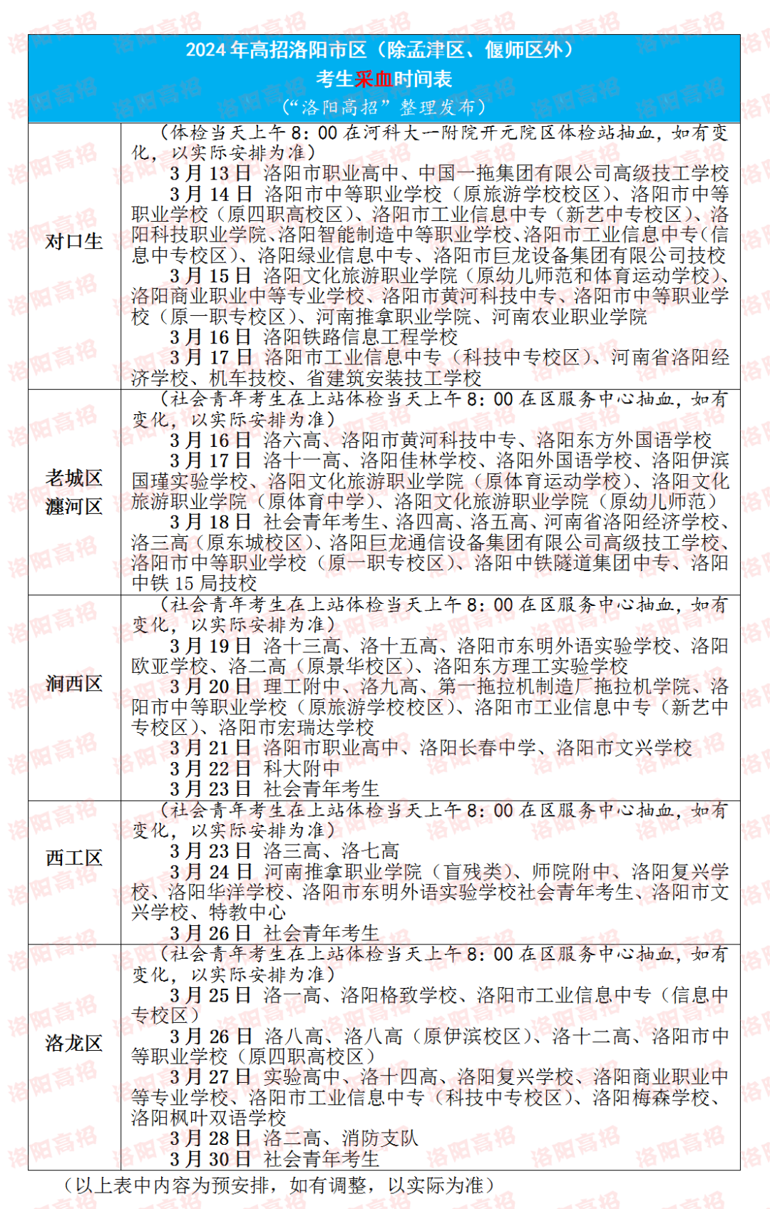市区(除偃师、孟津外)对口生体检时间为3月13日至17日,体检当天上午8点在河科大一附院开元院区抽血。