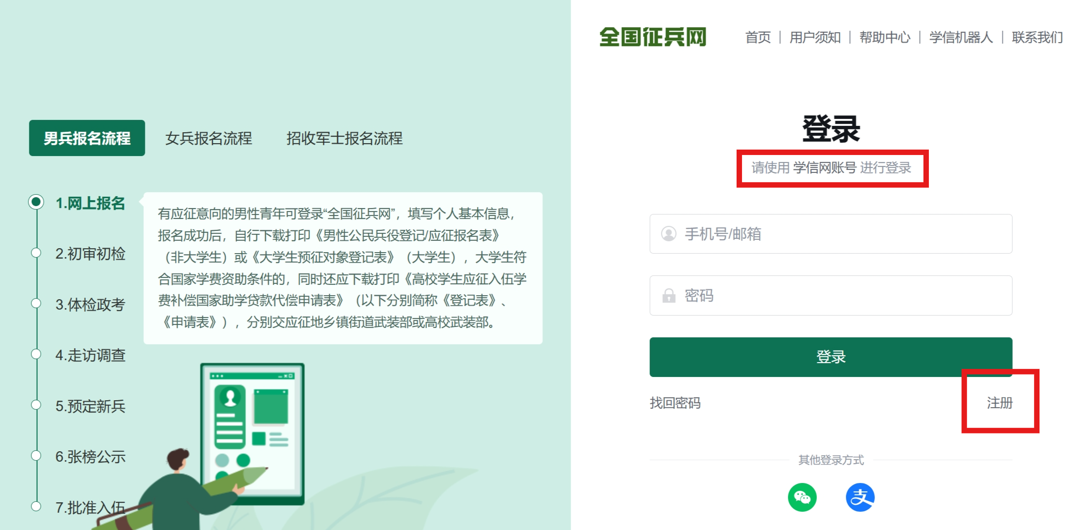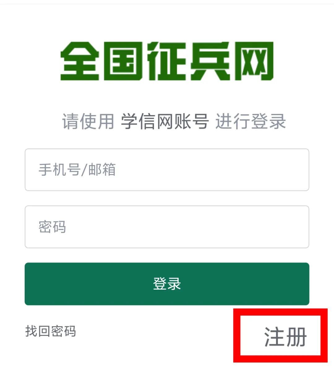 已知自己学信网账号和密码的青年可直接登录,继续完成兵役登记;未注册过学信网账号的青年,需先完成学信网账号注册,才能登录全国征兵网。