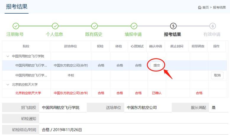 考生最多可同时确认两个有效招飞申请,若已经确认的某申请背景调查不合格,则考生在【报考结果】页面,可以重新确认另一个招飞申请。