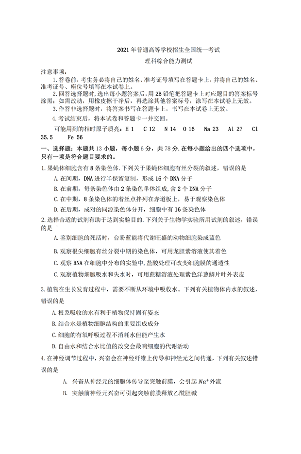 2021全国乙卷理综试题