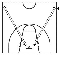 测试方法:考试采用28m×15m的标准场地的一个半场进行测试。测试者持球从场地端线中点外处出发,用右手运球上篮,如球不进则补篮,直至球进后,再用右手运球至右边边线与中线的交接点,然后折回,用左手运球上篮。球进后,用左手运球至左边边线与中线的交接点,然后折回,同样重复上述运球投篮。第四次投篮入圈停止计时表(见图1)。每人两次机会,取最好成绩。