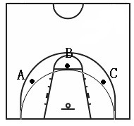 测试方法:以篮圈中心投影点为圆心,以该点至罚球线的距离为半径,画一圆弧(见图2)。考生投篮开始同时开表,考生投篮抢篮板后运球至弧线外A、B、C任意一点再投篮,如此反复一分钟。男子必须跳起投篮,女子可采用原地投篮。