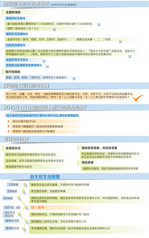 17日,教育部、国家民委、公安部、国家体育总局、中国科学技术协会联合公布《关于进一步减少和规范高考加分项目和分值的意见》,2015年1月1日起,取消6项全国性加分项目,保留和完善5项全国性加分项目。大幅减少地方性加分项目,地方性加分原则上只适用于本省份所属高校在本省份招生。同日,教育部发布《关于进一步完善和规范高校自主招生试点工作的意见》,直接回应自主招生这一社会热点。
