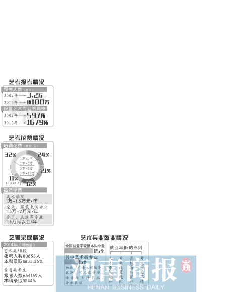 不只是在河南,过去的10多年里,全国都掀起了“艺考热”。据统计,从2002年至2013年,全国设置艺术类专业的高校从597所增至1679所;艺术类考生人数从3.2万增至近100万,增加30多倍。