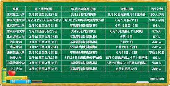 2016年的高考安排在6月7日、8日两天进行,高考后的第一个周末是6月11日、12日。11所高校中,北京师范大学、武汉大学、西安交通大学、中山大学都把考核时间安排在6月11日、12日两天;北京化工大学、北京邮电大学和长安大学,则是6月10日报到,次日考核;北京交通大学6月10日、11日测试;中国传媒大学6月11日笔试,面试则安排在6月12日至14日。