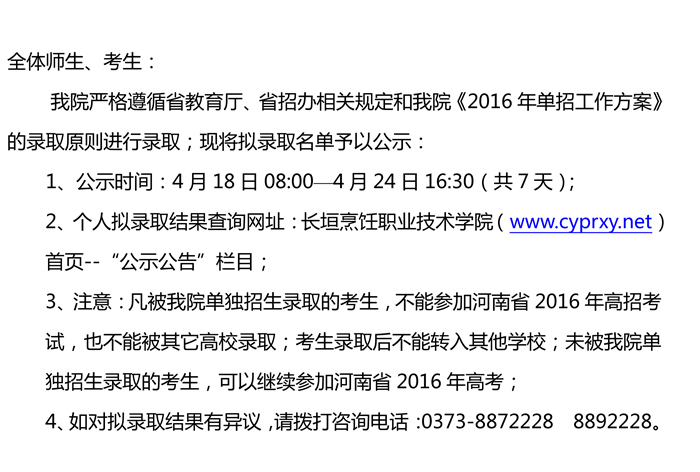 长垣烹饪职业技术学院16年高职单招拟录取考生名单公示