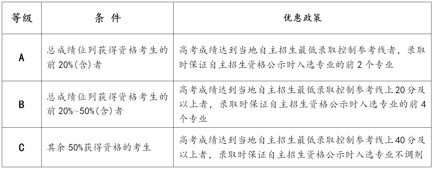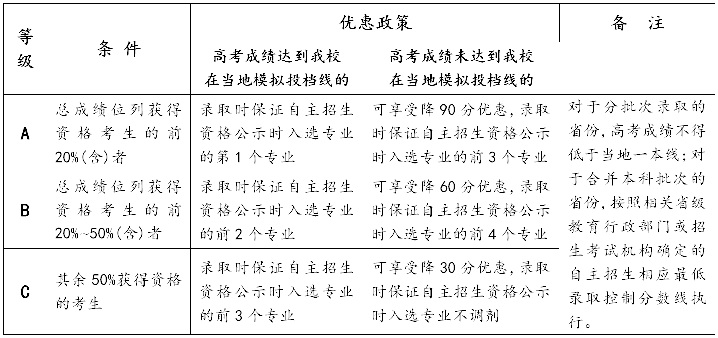 4.资格认定:学校将根据考生的总成绩(初试成绩+复试成绩)由高到低择优确定自主招生资格考生名单和优惠等级。获得自主招生资格的考生须通过自主招生报名系统再次填报专业志愿,我校将按照第五条“优惠政策”的有关规定进行高考专业录取;