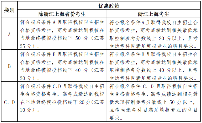 经认定的自主招生合格考生必须参加2018年高考,且高考成绩达到生源地省份本科第一批次录取控制分数线上(对合并本科批次的省份,按相关省级教育行政部门或招生考试机构相关政策执行),按生源地省级招办(考试院)的统一安排和我校相关要求,在自主招生指定志愿位置填报公示专业,可享受以下优惠政策: