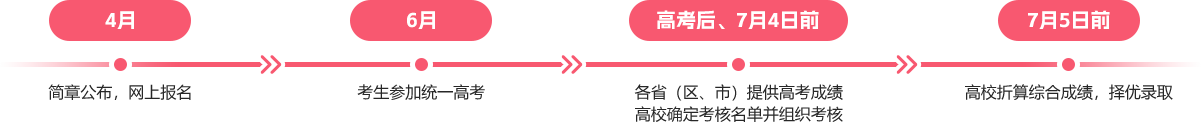 3月底前,试点高校发布年度强基计划招 生简章。4月,符合报考条件的考生可在 网上报名参加强基计划招生。6月,所有 考生参加统一高考。6月25日前【详情】