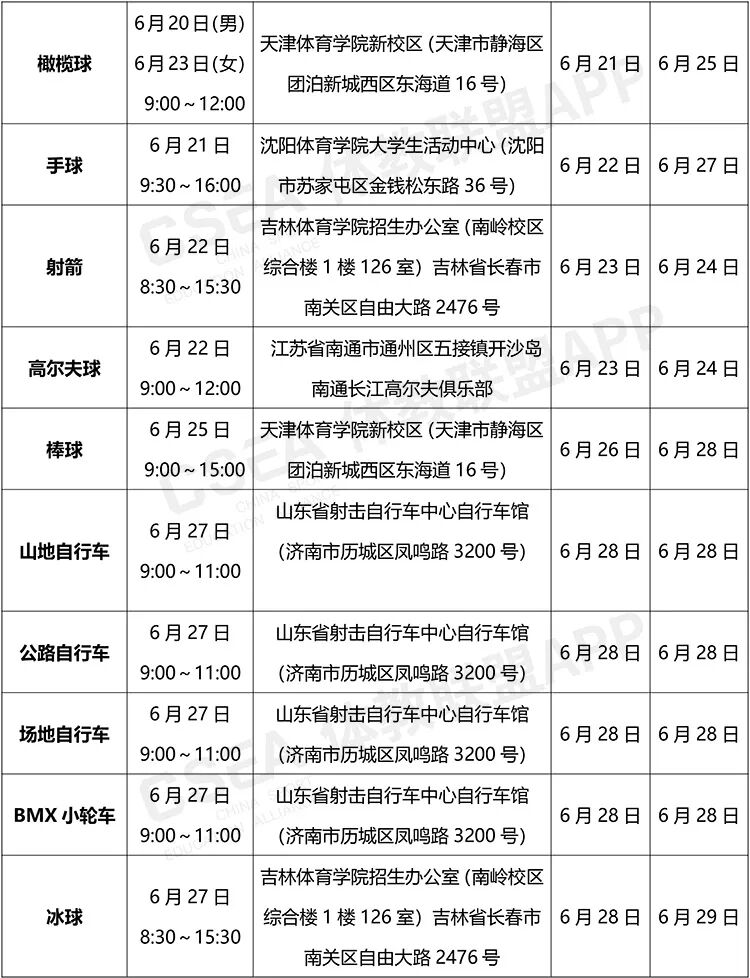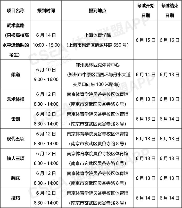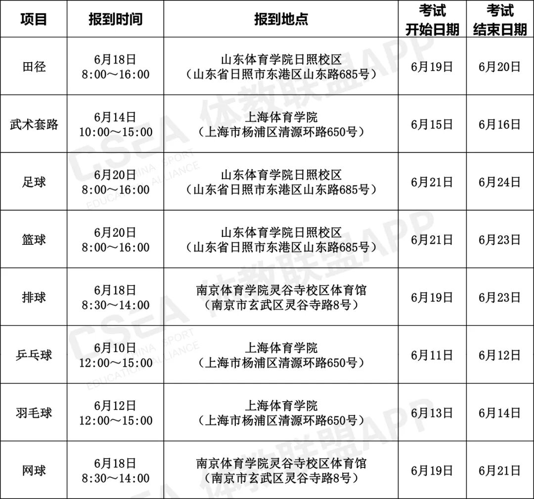 田径、足球、篮球、排球、乒乓球、羽毛球、网球和武术套路项目根据招生院校所在地进行分区域统考,考生按照一志愿报名院校所在区域参加考试,具体安排如下: