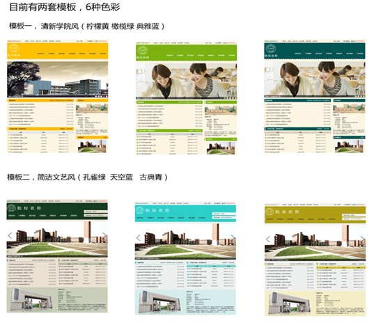 我们的美工运用当前最流行的元素对页面进行布局,一改过去的刻板印象,新版院校页面,两套模板的6种色彩,紧扣年轻人的喜好,突出时尚清新的学院气息。会员学校可以根据自己的喜欢在后台自定义使用。同时,根据学校的具体需求,我们也可以为您量身定制更加个性化的专属模板。