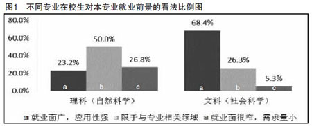 (一)在校大学生中,文科生认为就业面广,对未来工作接受范围宽;理科生认为就业面窄,对未来工作专业要求较严格