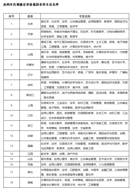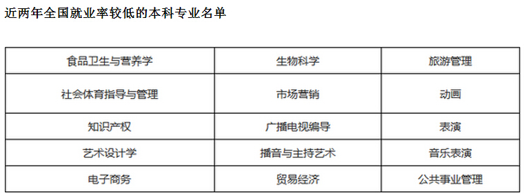 据了解,为了加强对高校专业设置的宏观管理,引导高校主动调整学科专业结构,教育部高等教育司整理并公布了近两年全国和各省的就业率较低的本科专业名单。