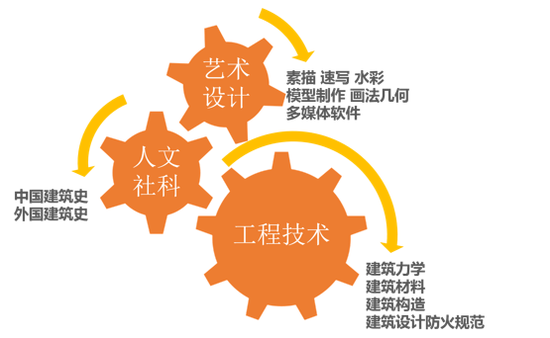 由于偏重设计,建筑学专业带有技术和艺术相结合的特点。建筑学学科知识体系综合了工程技术、人文社科与艺术设计等领域。学习该专业不仅要熟悉中西方建筑史,掌握现代设计技术,还要像美术生一样学习绘画。其主干课程包括:建筑设计基础、建筑设计原理及设计、建筑构造、建筑力学和建筑结构、素描、水彩等。