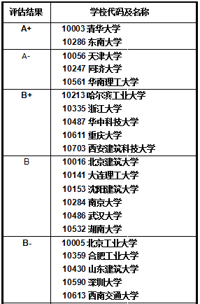 清华大学和东南大学分别位于学科评估A+,位列榜首。两所学校也一直和同济大学、天津大学合称为建筑学“老四校”。